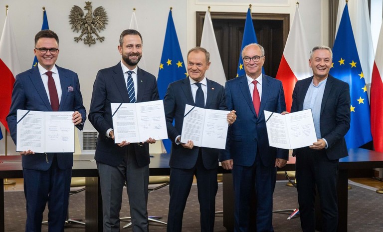 Liderzy Koalicji Obywatelskiej, Trzeciej Drogi i Nowej Lewicy podpisali w Sejmie umowę koalicyjna, która będzie podstawą powołania nowego rządu. Włodzimierz Czarzasty, Robert Biedroń, Szymon Hoł...